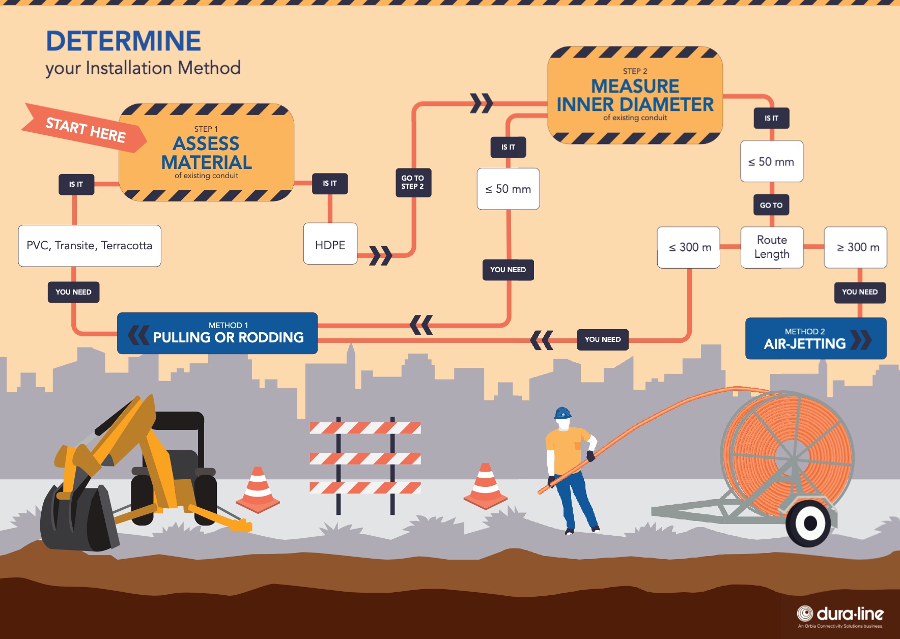 - Air-Jetting: uses a Y-block to isolate the existing cable and high-speed air to install the MicroDucts.