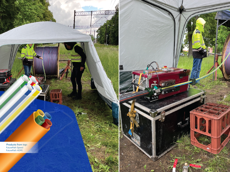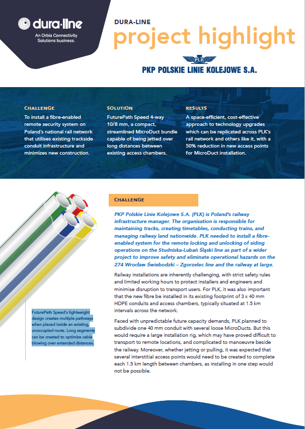 With Dura-Line on-site to oversee the installation, PLK’s contractor, ARMAT Sp. z.o.o., used a Terma MultiTyphoon machine to jet the streamlined FuturePath Speed an average of 1,100 metres, at speeds up to 30 metres per minute. This allowed ARMAT to limit the number of interstitial access points to just 10, a 50% reduction versus loose MicroDucts. And with a single reel to transport and manoeuvre around the jobsite, installation setup and takedown were also quick and straightforward.