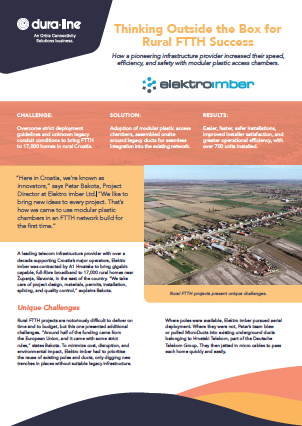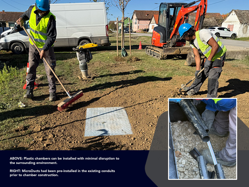 When Dura-Line proposed a switch to plastic chambers that could be constructed around the existing ducts with lightweight modular sections, Elektro imber were enthused. Following successful demonstrations, Field Application Engineers from Dura-Line arrived onsite to train installation crews in Slavonia for the first large-scale deployment. Chambers were placed every 150 metres, on average, with each serving eight homes (four to the left and four to the right) via single MicroDucts placed and secured with an end cap until each subscriber took service. Knowing that the height of the chamber could be adjusted with ease, the installation crews simply dug until they reached the legacy ducts then constructed the modular chamber around the existing pathways. And because the chambers were constructed on site, Petar’s technicians were able to save significant time by preinstalling the MicroDucts into the legacy conduits. With a precast concrete chamber, the legacy duct would have needed to be cut prior to placing the chamber, before installing the MicroDucts from hole to hole.