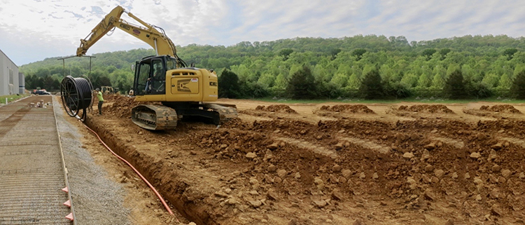 Trenchers of all types – from portable walk-behind to large chain tractor and wheel/rockwheel types – are used to construct trenches for HDPE duct applications. The key when using the trencher is to keep the trench depth as even as possible and the width proportional to the ducts or bundles being placed in the trench.