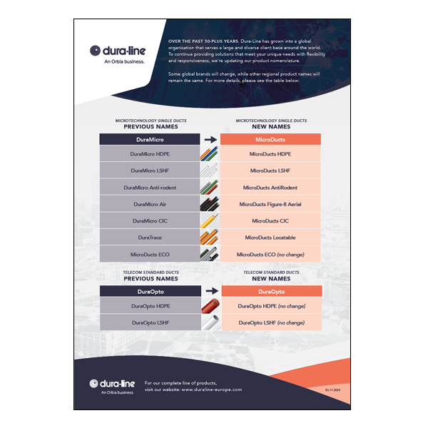 OVER THE PAST 50-PLUS YEARS, Dura-Line has grown into a global organisation that serves a large and diverse client base around the world. To continue providing solutions that meet your unique needs with flexibility and responsiveness, we’re updating our product nomenclature.